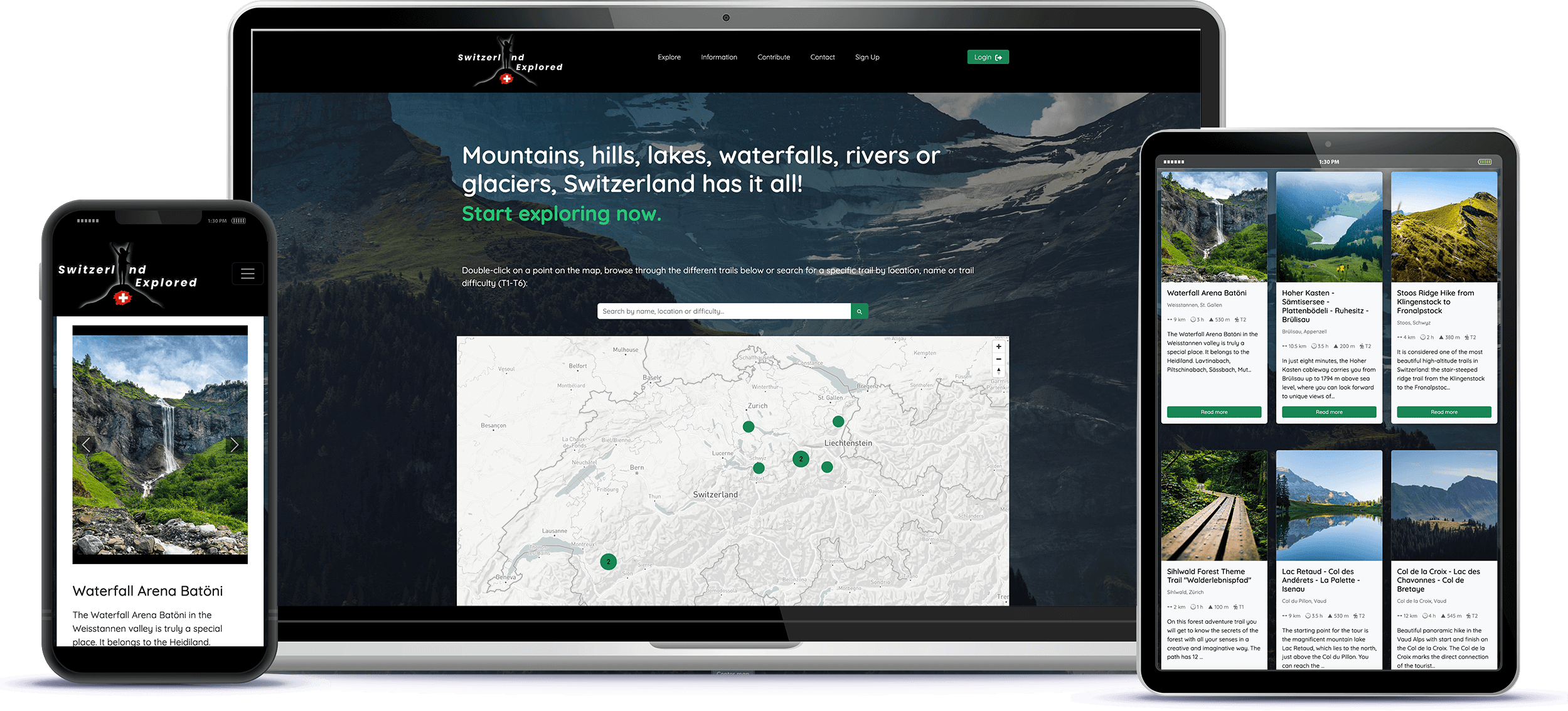 Als begeisterter Wanderer wollte ich einen Ort schaffen, an dem ich alle meine Wandererlebnisse in der Schweiz sammeln und mit anderen teilen kann. Jeder Benutzer kann ein Konto erstellen und eigene Wanderungen zur App hinzufügen. Alle Wanderungen werden auf einer Karte angezeigt und auf der Erkundungsseite präsentiert. Die Benutzer können nach bestimmten Wanderungen nach Ort, Name oder Schwierigkeitsgrad suchen. Eingeloggte Nutzer können auch Bewertungen abgeben und Wanderungen zu ihren Lesezeichen hinzufügen.